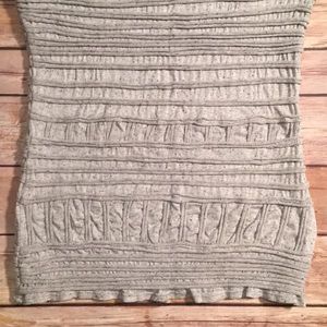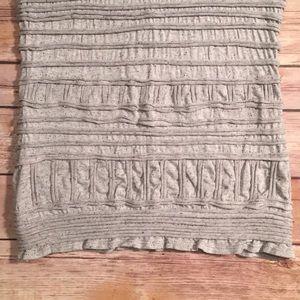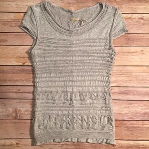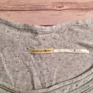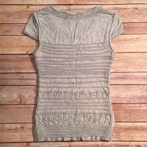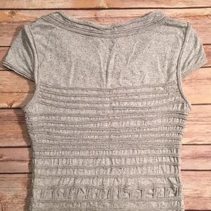 Gray tee flecked with black dots. In a ribbed, textured, stretch fabric. Cap sleeves. Scoopneck. Elastic throughout top. Slightly ruffled bottom hem. Viscose/poly/elastane.