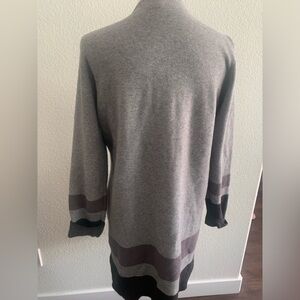 Chic open-front cardigan. Soft gray with brown accents. Ideal for layering.