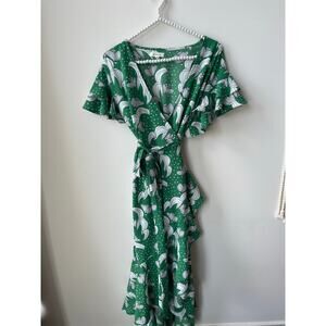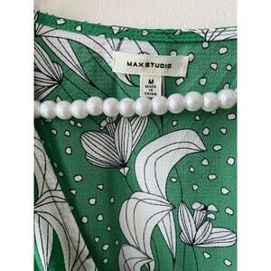 Elegant and breezy, this Max Studio dress features a flattering wrap silhouette with a tie waist, cap sleeves, and a cascading ruffle hem. The green base is adorned with a bold white floral and polka dot print, adding a touch of vintage charm. Perfect for spring and summer events, brunch, or vacation wear. Made from lightweight, breathable fabric for all-day comfort.