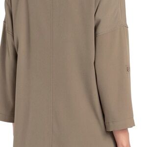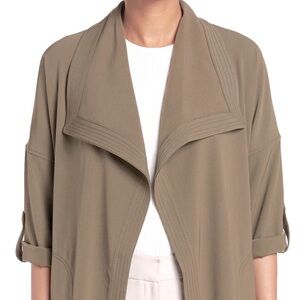 This Max Studio trench coat in a rich green hue features a tailored silhouette with notched lapels and long sleeves. Its minimalist design and smooth texture make it a versatile addition to any wardrobe, perfect for both professional and casual settings. Labeled XS; fits like S.