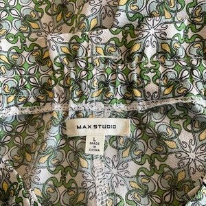 Experience effortless style with these Max Studio wide leg pants, featuring a chic green and white geometric pattern. The relaxed fit and lightweight fabric ensure comfort, making them perfect for casual outings. With a high-waisted design and elastic waistband, these pants offer a flattering silhouette for any occasion.