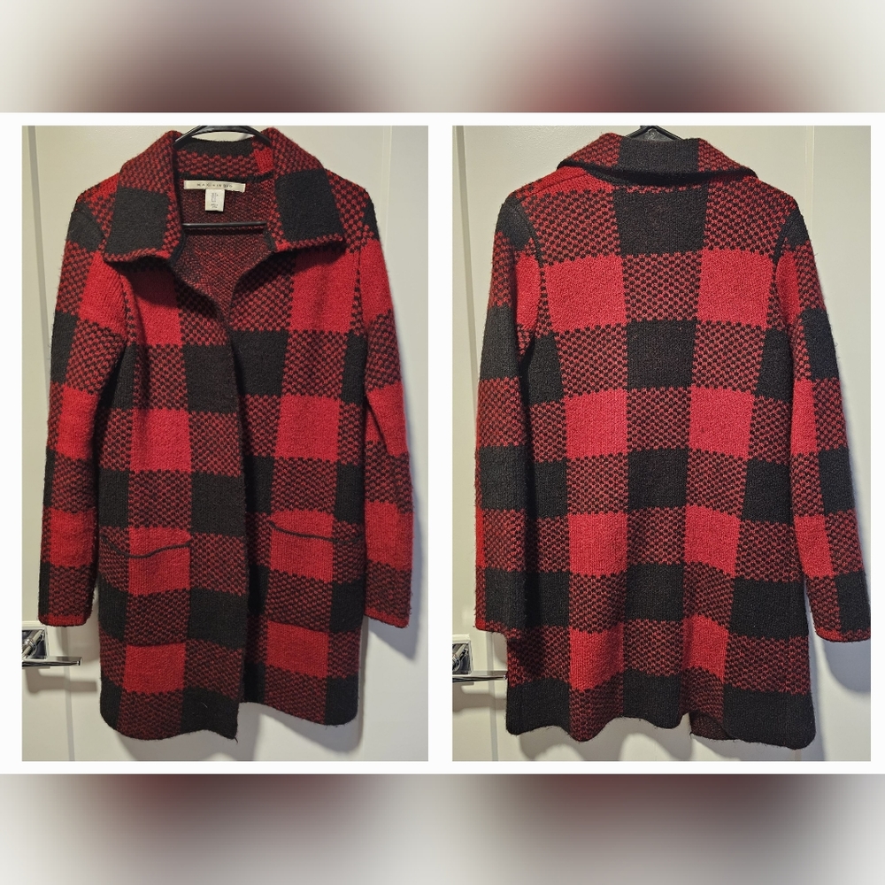 Women's size small Max Studio long wool sweater jacket. Very soft and warm, has 2 pockets. Black and red plaid. Used/very good condition.