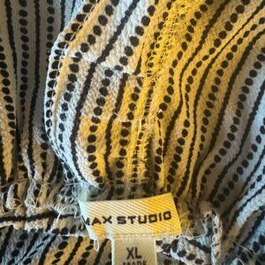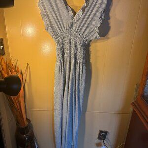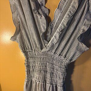Excellent condition black & white stripe jumpsuit with flare legs. V-neck front and back with ruffle details. side pockets and elastic waist. 96% polyester & 4% spandex.