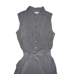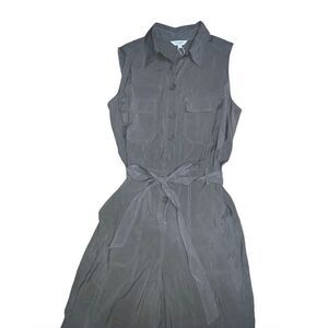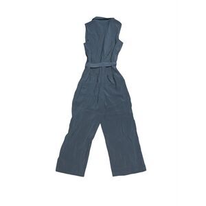 Sage green sleeveless jumpsuit. Waist tie. Collared. Button front. Chest, waist and back pockets. 85% rayon/15% polyester. Size: large. Original price: $168.00. NWT.