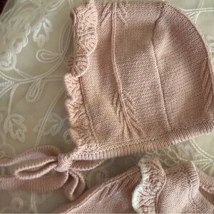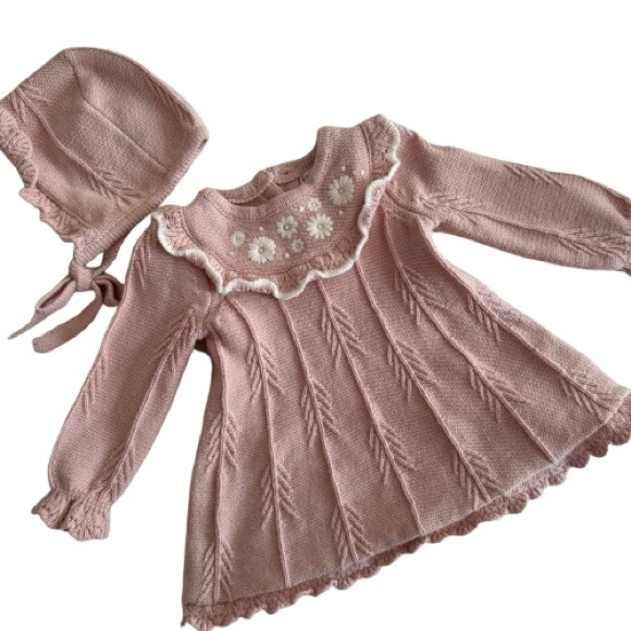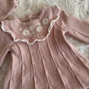 Adorable pink knit set with floral details. Includes dress and matching bonnet. Perfect for special occasions.