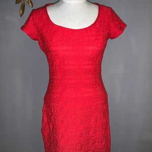 Max Studio Knockout Red Contour Dress - Medium. Poly/Spandex stretchy textured knit is comfy and beautiful. Good Used Condition but has a SMALL STAIN on back of dress just below the collar (see photo).