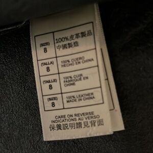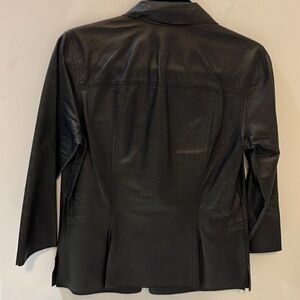 Max Studio Black Leather Blazer Style Jacket (Unlined) 3/4 Sleeve. Self fabric Flat Buttons (4 total - 2 need to be pressed flat and too button thread can use tightening see close up