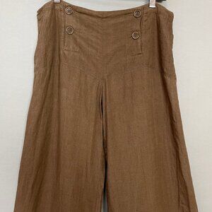 Max Studio women's brown linen pants with wide legs, sailor style button-front and drawstring in back. Little cut-out eyelet detail at the top of the legs.