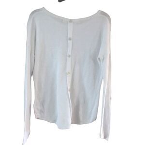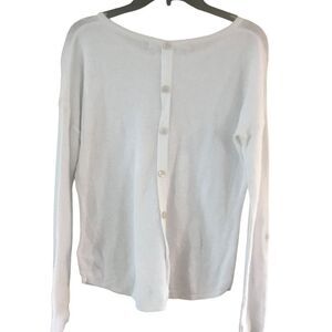 Max Studio white long-sleeve sweatshirt in size medium. The material is 55% linen and 45% cotton. Features decorative buttons on the back. Excellent condition with no issues. P 187A304