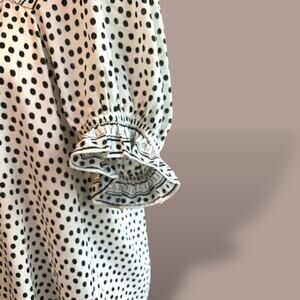 Stylish and versatile top for everyday wear. Lightweight and flowy bold white and black polka dot pattern with contrasting pattern around hem and neckline. Slight puff sleeves.