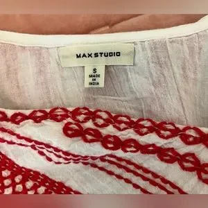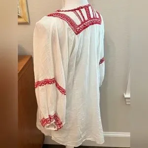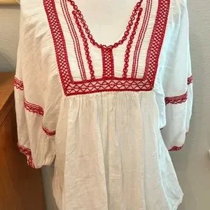 Medium. Light weight. Squared neck with red embroidery. A little see through so you may or may not require a cami. Excellent condition.