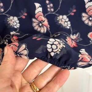 The Max Studio Navy and pink/peach: pleated bodice in front and back. Elastic bottom. Totally lined. 100% polyester. Slip over head and tie in back.