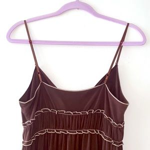This Sexy and Sleek Max Studio Maxi Dress comes alive for any event and season, and this always does the trick…No more hassle deciding on casual or dressy. Dress it up glitzy or casually down with your accessories. Adjustable straps, bust has soft breast cups that can fit most sizes well. Great condition. Worn twice. Mocha to medium brown color with ivory lining on ruffles and seems. Machine washable and sheer material for ultra comfy classic look.