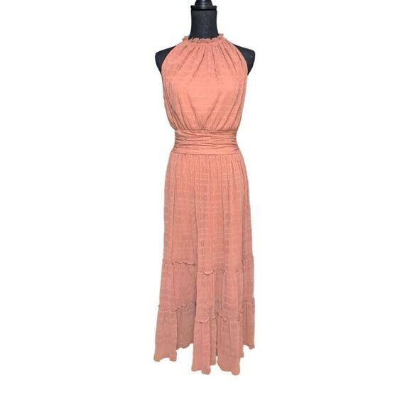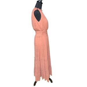 Cedar wood tiered lace mesh maxi dress. Back keyhole with tie closure. Mock neck. Sleeveless, with cutaway shoulders. Lined. 94% nylon/6% spandex. Size: small. Original price: $198.00. NWT.