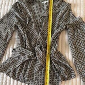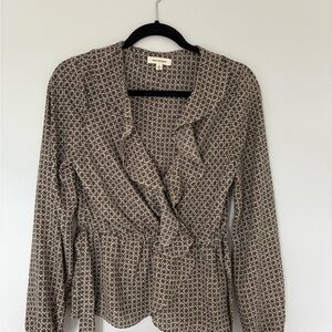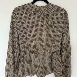 Chic blouse with intricate patterns. Features a blend of black, brown, and cream. Ideal for versatile styling.