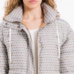 Chic waist length puffer jacket with a multicolor geometric design. Features a stylish blend of cream, brown, and navy tones. Complete with a funnel neck and button or zipper options. Size SMALL but fits like a medium. Worn once, so in great condition Price is NOT negotiable. HOOD NOT INCLUDED. Thank you for looking 🥰