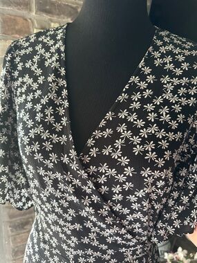 Chic midi dress with a classic polka dot print. V-neckline and short sleeves. Wrap-style tie at the waist for shape. Flowy skirt offers easy movement. Timeless navy and white palette.