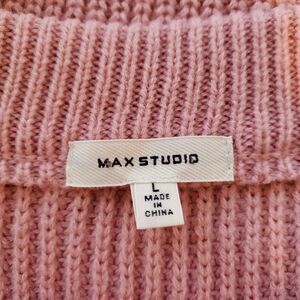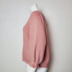 Max Studio pink knit 3/4-sleeve balloon-sleeve sweater. Has wide neck that can be worn in multiple ways and ruffled sleeve cuffs.
