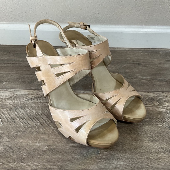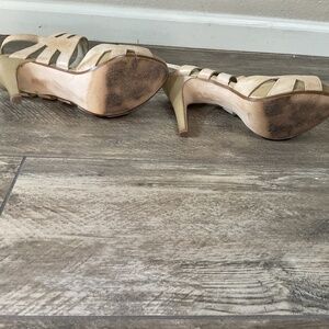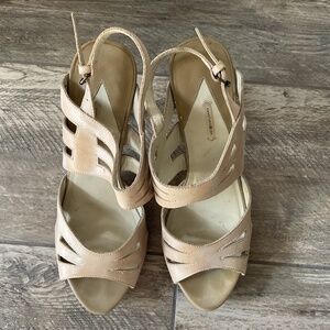 Good condition tan platform sandals. Very comfortable but too high for me at 4 and 1/2 inch heel with approx 1 inch platform