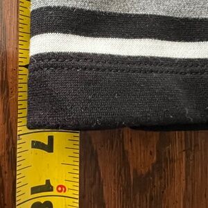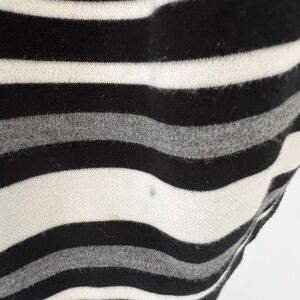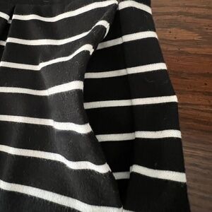 Elastic waist with black and white horizontal stripes. Near the bottom are a couple of gray stripes with a wider white stripe. Skirt has wide box pleats.