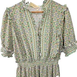 New with Tags Max Studio London plus size 1X maxi dress with an elegant green crepe floral art nouveau print. Features a v-neckline, stand-up ruffled collar, and soft ruffled puff short sleeves. The blouson bodice, smocked waist, and stretch fabric create a flattering fit, while the tiered skirt adds movement and flow. The botanical print blends boho, peasant, milkmaid and cottagecore styles for a versatile piece you can dress up or down. Perfect for vacations, garden parties, wedding guest, or everyday style.