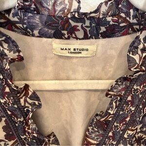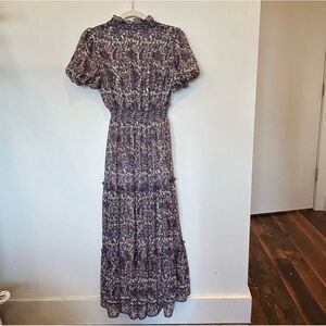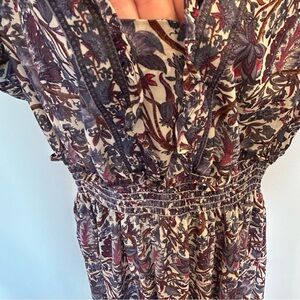 Elegant maxi dress with floral pattern. Features short sleeves and a v-neckline. Perfect for any occasion.