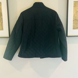 Navy quilted jacket by Max Studio. Features bold red zippers and gold buttons. Ideal for layered looks this fall.