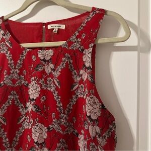 Red floral flowy tank top with a keyhole detail at the back neckline. Sleeveless, scoop neck, lined, slight high low hem. Preowned in very good condition, no holes or stains.