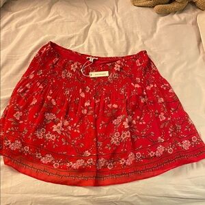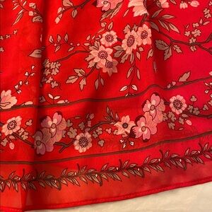 Elegant Max Studio skirt with thick shirted waistband for maximum flexibility (can you say all-you-can-eat buffet?) and a fully lined sheer floral pattern skirt. Bright red hue with a lovely Asian inspired floral pattern with touches of pink and taupe - has a cherry blossom 🌸 vibe. Ideal for fall with leggings and boots, summer with a white t-shirt or spring with a lightweight pink sweater. Not too short either so your don’t show off your 🍑