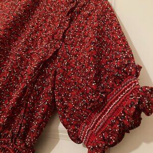 Max Studio Red with Micro Floral Long Dress – Size S – Ruffle Neckline & Smocked