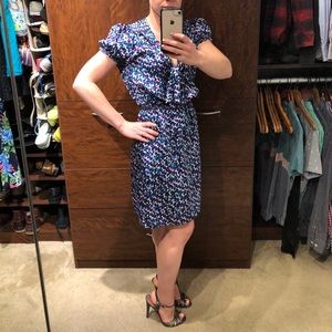 This Max Studio dress is perfect for the office. I loved it but only wore it a few times before I switched to an office where it is now too dressy to wear. The square print is a combination of navy, turquoise, purple and white. 100% polyester but has a satiny feel and sheen. Elastic around the sleeves and waist. Short length - model is 5” tall. Great for petites! 3 buttons on front and then a bow that ties. Neck is a lower v-neck. Stitching detail on shoulders and around back.