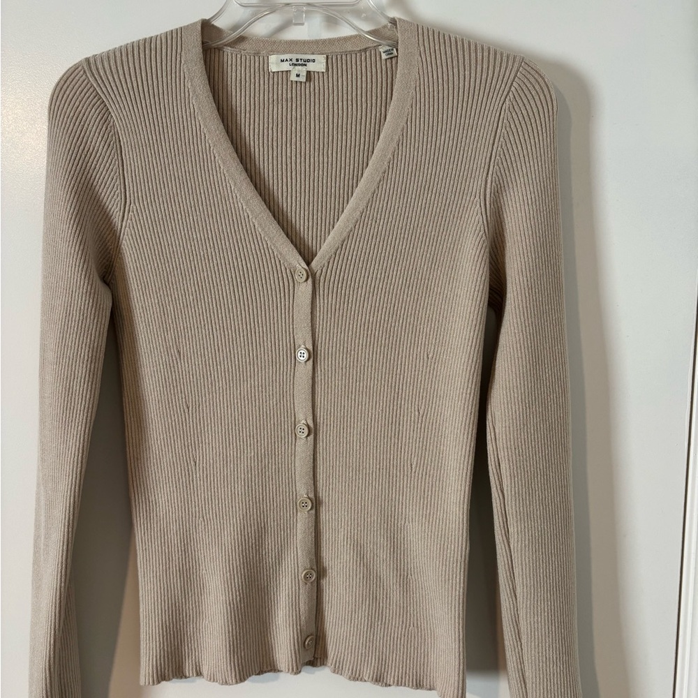 Max Studio Soft V-neck cardigan features a slim ribbed knit design and a front-button closure.