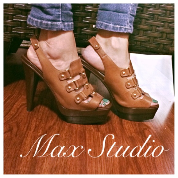 New & never worn max studio heels. , the MAXSTUDIO Raptor sandal belongs in your collection! ; Leather upper with hardware detailing. Adjustable hook-and-loop closure at heel strap. Sexy double platform. Man-made lining and sole. Approx Heel Height: 4 3/4" & Platform Height: 1.5". Still selling on other sites $85 & up.