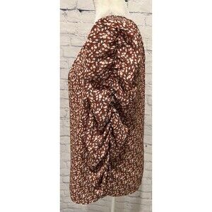 Max Studio Ruched Sleeve Floral Blouse Top in size medium is a versatile and stylish addition to any woman's wardrobe. Made of lightweight polyester material, this blouse features a feminine floral pattern and ruched sleeves for a touch of sophistication. The brown color and pullover closure make it perfect for various occasions, whether it's for travel, casual outings, or workwear. With its long sleeves and basic style, this blouse can be worn in any season, making it a timeless piece for any closet. 21 inches pit to pit and 24 inches long. Smoke free home.
