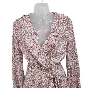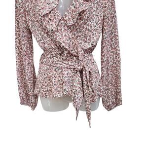 Max Studio Ruffle Peplum Blouse Long Sleeve V-Neck Tie Waist Floral Pink Size XS