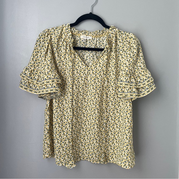 Max Studio ruffled print top. Tassel string tie detail. Size S