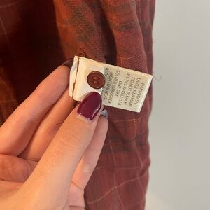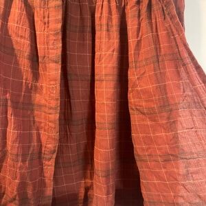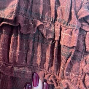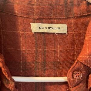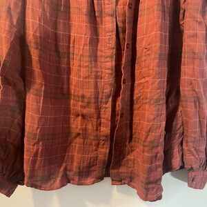 Max Studio button-up blouse in a warm rust plaid. Ruffle detail across the yoke. Long, slightly gathered sleeves with button cuffs. Lightweight woven fabric with subtle texture.