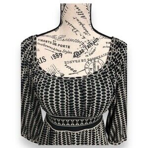 Description: Stylish Max Studio top in a bold black-and-white geometric print with an empire waist and square neckline. Stretchy, comfy, and perfect for a flattering boho look.