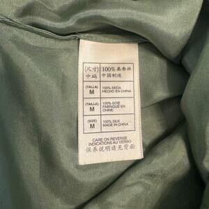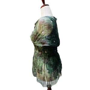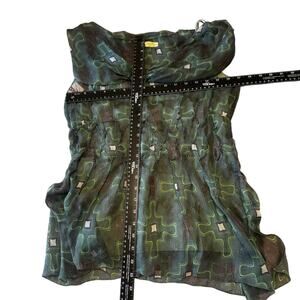 egant Max Studio silk blouse in a sheer green geometric print overlay with a matching silk cami lining. Features a gathered waist with delicate beading and a flowing hem for a flattering silhouette. New with tags and perfect for special occasions or elevated casual looks.
