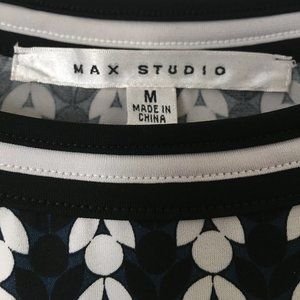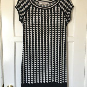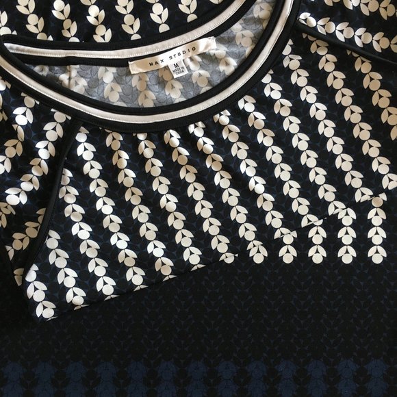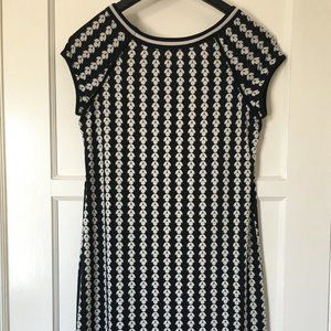Pullover shift dress with navy blue and white pattern and navy accent hem. Black and white trim on collar. Wrinkle free fabric, soft and easy to wear. Very flattering cut. Form fitting but not tight. Scoop neck, raglan cut cap sleeves.
