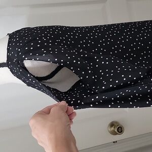 Max Studio Size XS Black with White Polka Dot Split Sleeve with Tie End Blouse, Excellent Used Condition. No Holes, Rips, Stains or Snags. Suepr Cute Black Round Neck Blouse with 3/4 Length Sleeves Split from Shoulder. Tie Detail at Cuffs. Keyhole back with Button Closure. Please refer to measurements in photos to ensure proper fit. Shown on size 4-6 Mannequin.