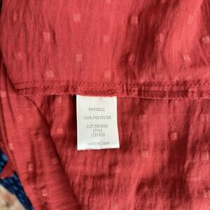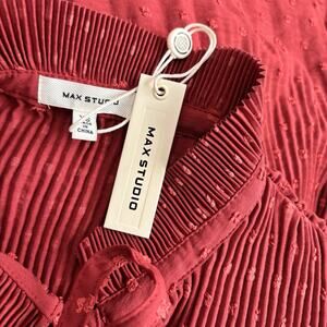 Max Studio Size XS Tie Neck long Sleeve Dot Pleated Shirt in wine color is a stylish and versatile blouse perfect for various occasions. The halter neckline with a tie closure adds a chic touch, while the pleated accents and clip dot pattern give it a trendy look. Made from lightweight polyester material, this tunic-style top is suitable for all seasons and is designed for regular fit. Ideal for party, casual, or business settings, this blouse is a must-have for any fashion-forward woman's wardrobe.