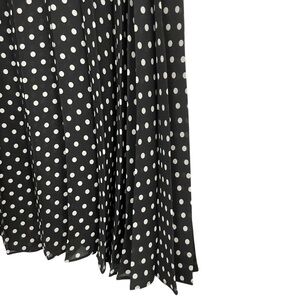 Black Max Studio skirt with white polka dots and pleats. This skirt is midi-length and features an elastic waistband. Polka dots have seen varying levels of popularity throughout history, experiencing notable peaks in the 1920s, 1940s, and 1960s, which contributes to their retro appeal. Recently, the pattern has resurfaced in popular culture, with some suggesting a correlation between celebrities wearing polka dots and pregnancy announcements.