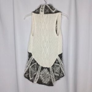 white knit vest with grey faux fur trim collar - super soft - cotton/nylon blend - open front - tapered - snowflake pattern - gray & white