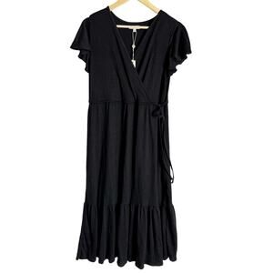Max Studio Solid Black Flutter Short Sleeve Faux Wrap Midi Dress Size Large