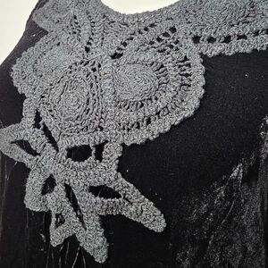 Vintage Max Studio Specialty Products (M.S.S.P.) crushed-velvet dress from the late ’90s–early 2000s, featuring a beautiful crochet floral medallion neckline and soft stretchy velvet texture. Can be dressed up for the holidays, styled for gothic/Y2K looks, or worn casually with boots and a jacket.