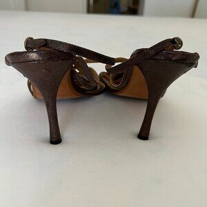 -Details: silver ankle buckle closure, brown with subtle metallic snakeskin print, in excellent pre-loved condition