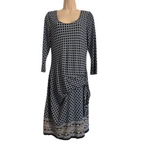 Max Studio Stretchy Mock Wrap Size Large Print Dress 3/4 Sleeve Blue Scoop Neck