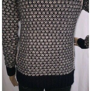 FEATURES/DESCRIPTION: Scoop neck, long raglan sleeves, waist length, casual fit. Dark navy blue (almost black) and ivory white high texture patterned knit. Unique and cute. Soft, stretchy, comfortable winter sweater.