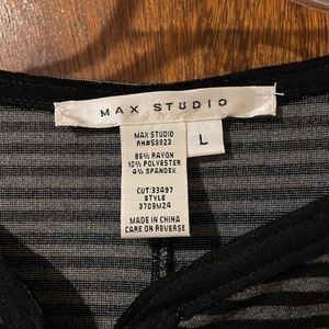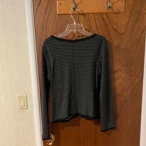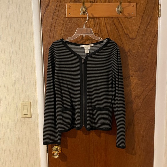 Stylish long sleeve grey/black stripes and front zipper make a fashion statement! Size L.
